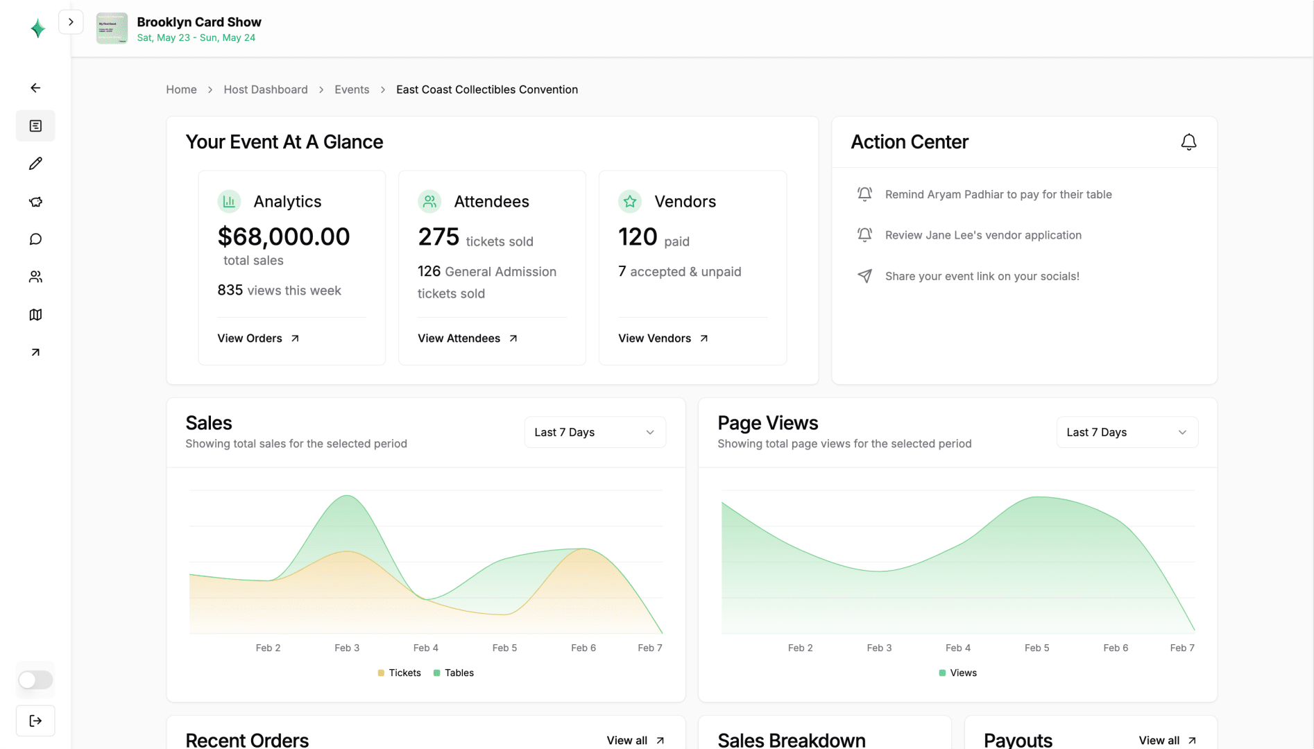 See your sales breakdown across different items, your payouts, and recommended actions to stay on top of your event management all in one place