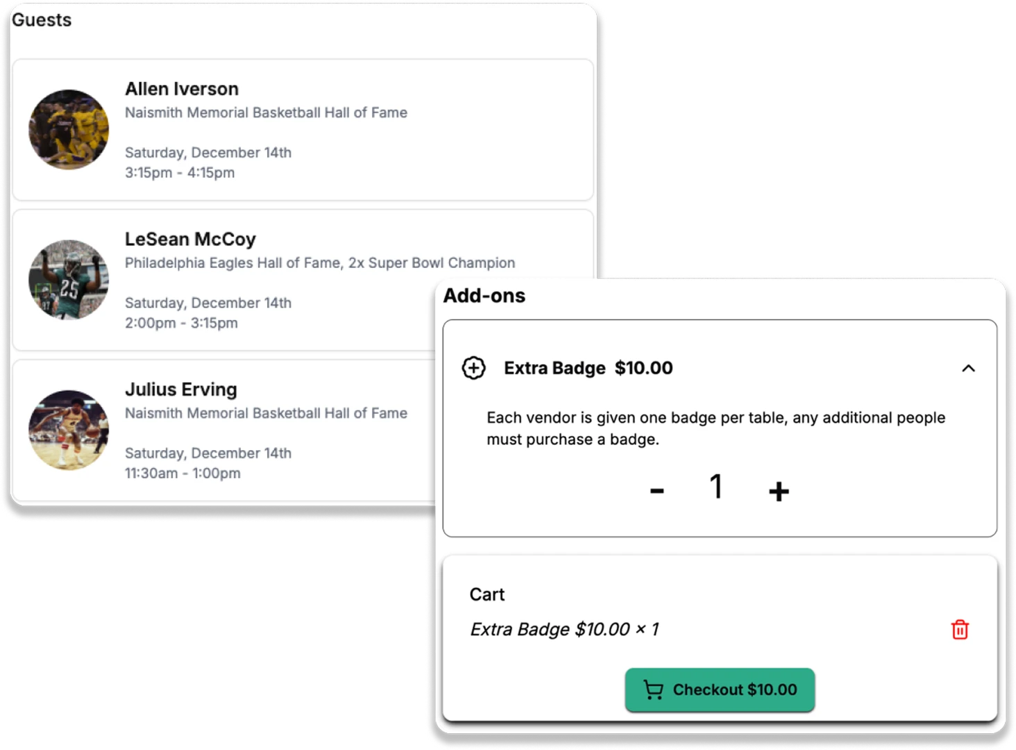 Showcase event guests with images and bios directly on your page, and create add-ons tied to specific tickets or vendors