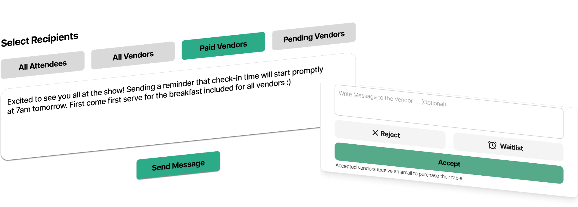 Notify your attendees and filtered groups of vendors about event updates, directions, and important information for the day of your event