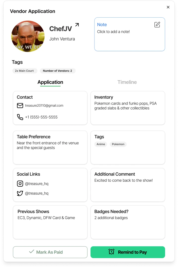 Create custom application questions and upload vendor contracts so you get the full picture on vendors that apply to your events